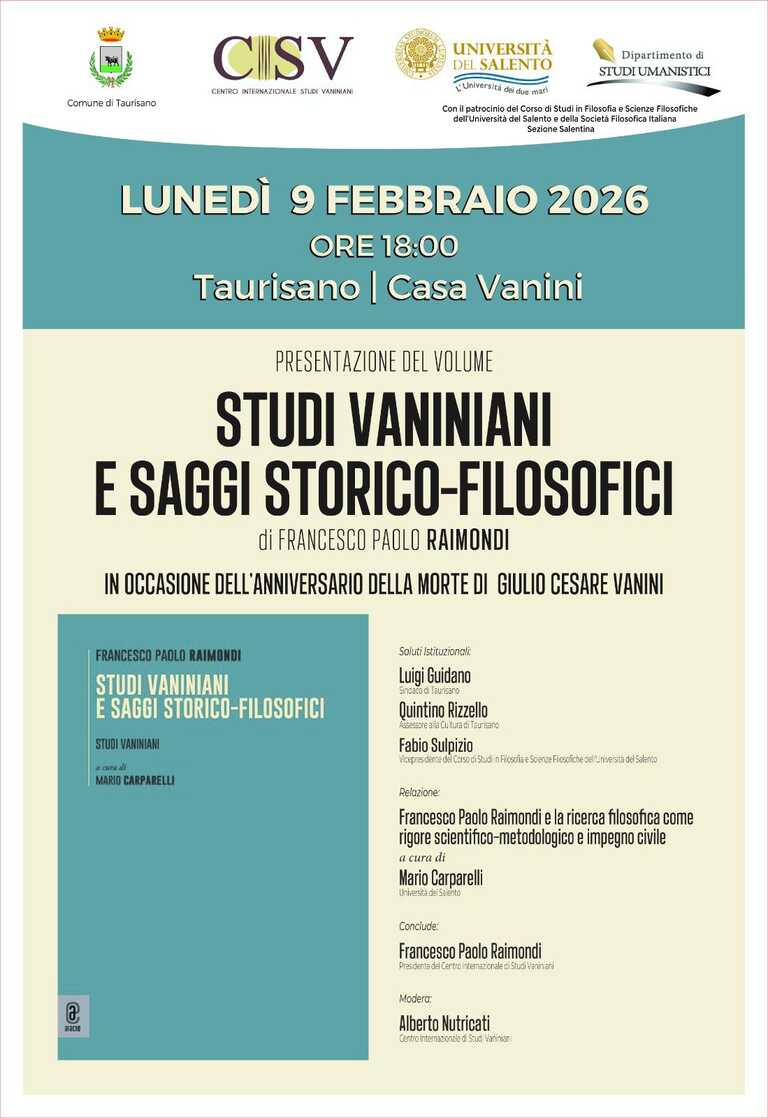 Per l’occasione, lunedì 9 febbraio 2026 alle ore 18:00, vi aspettiamo a Casa Vanini per la presentazione del volume Studi vaniniani e saggi storico-filosofici di Francesco Paolo Raimondi, in collaborazione con il Centro Internazionale Studi Vaniniani e Università del Salento.