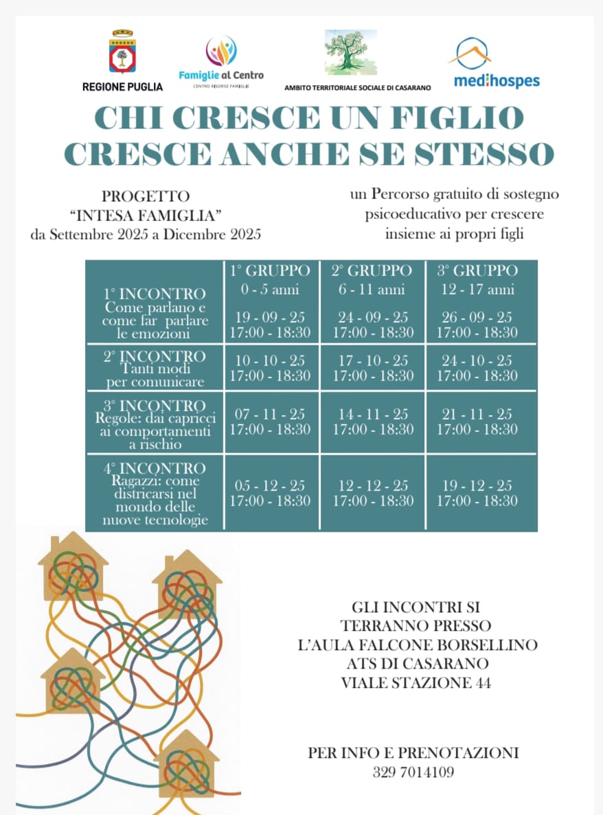 L'ambito Territoriale Sociale di Casarano, in collaborazione con la Cooperativa Medihospes, organizza una serie di incontri gratuiti di sostegno psicoeducativo rivolto ai genitori con figli dai 0 ai 17 anni.